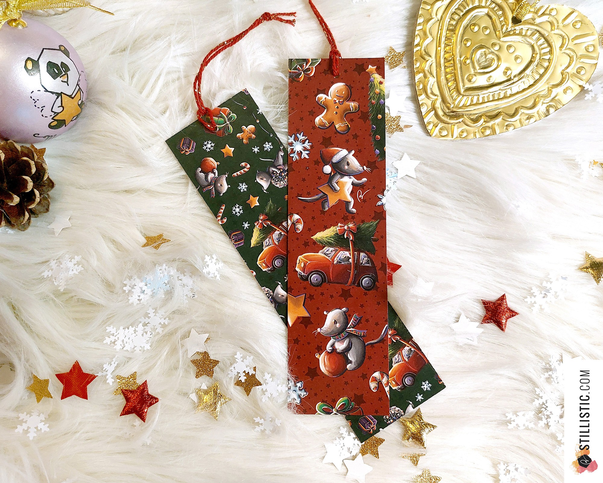 1 x Marque-page recto/verso 5 x 18 cm en papier recyclé orné d'un motif Souris de Noël (Illustrations originales Stillistic)