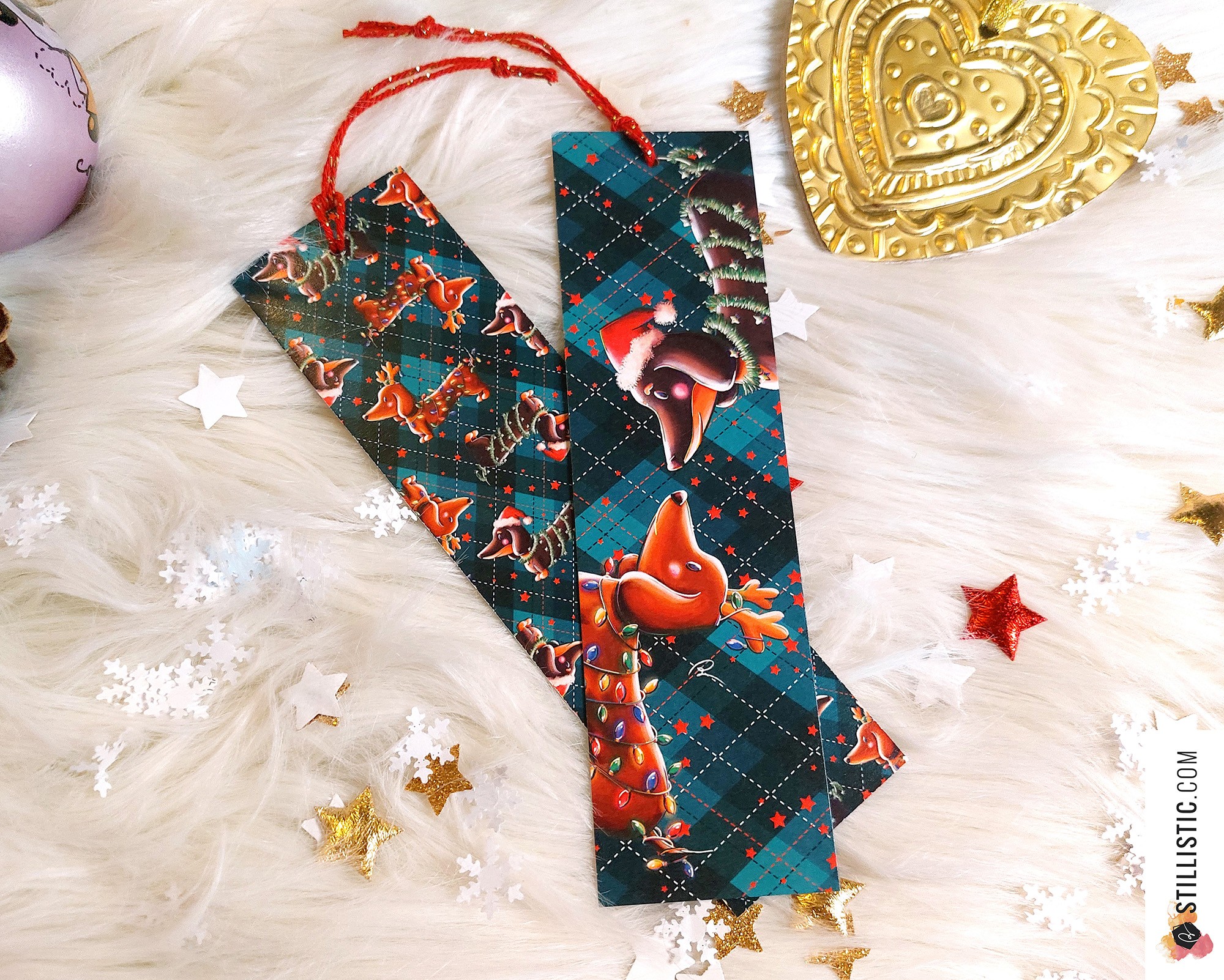 1 x Marque-page recto/verso 5 x 18 cm en papier recyclé orné d'un motif Teckels de Noël (Illustrations originales Stillistic)