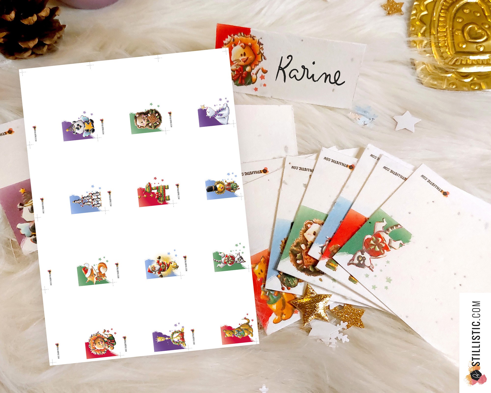 Une planche de 12 marque-places / chevalets de table festifs ornées de petits Animaux de Noël (illustrations originales Stillistic) à télécharger au Format PDF et imprimer chez vous pour ajouter une touche finale et originale à vos décos de tables de Noël !