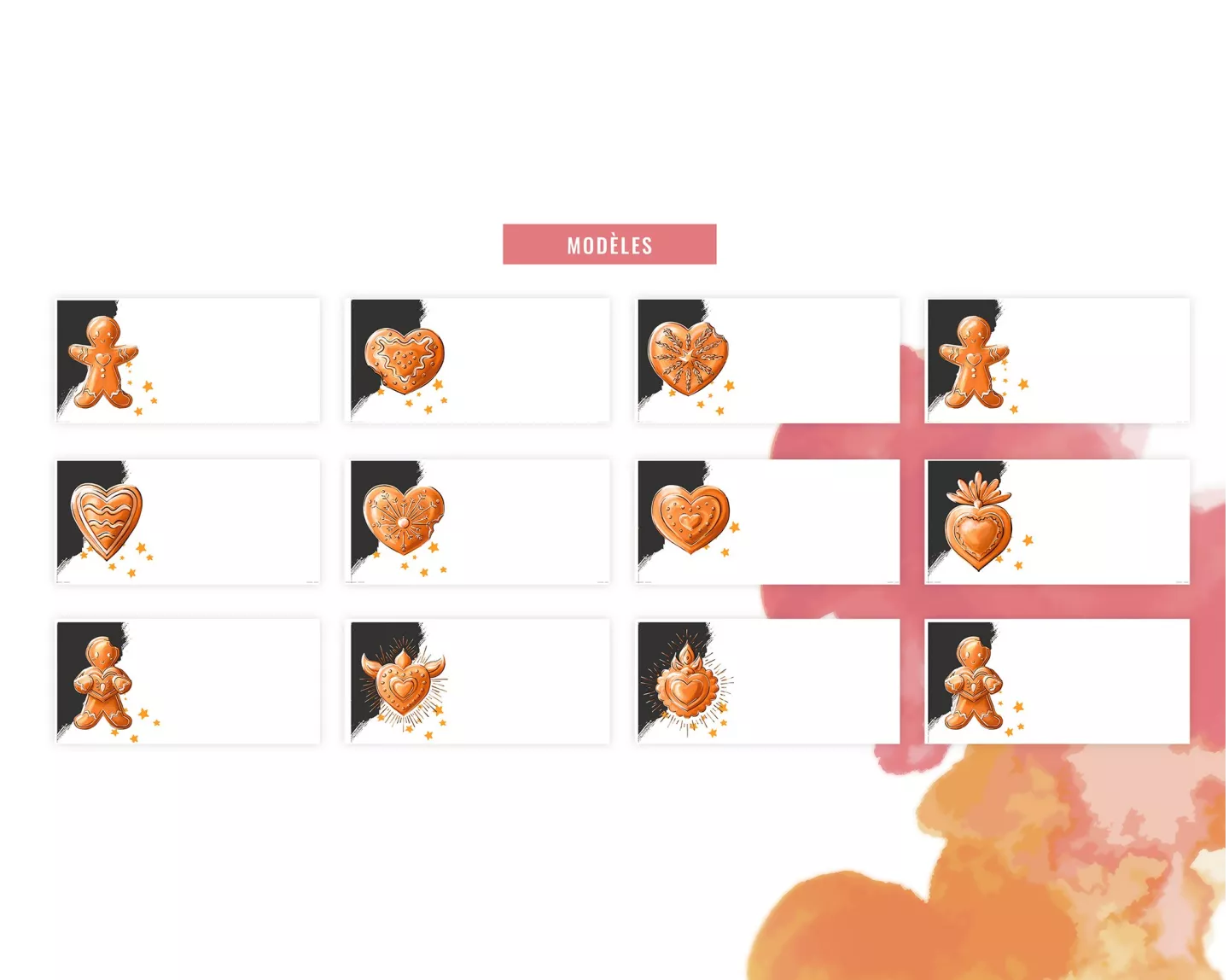 Une planche de 12 marque-places / chevalets de table festifs ornées de petits Coeurs ex-voto et pains d'épices de Noël (illustrations originales Stillistic) à télécharger au Format PDF et imprimer chez vous pour ajouter une touche finale et originale à vos décos de tables de Noël !