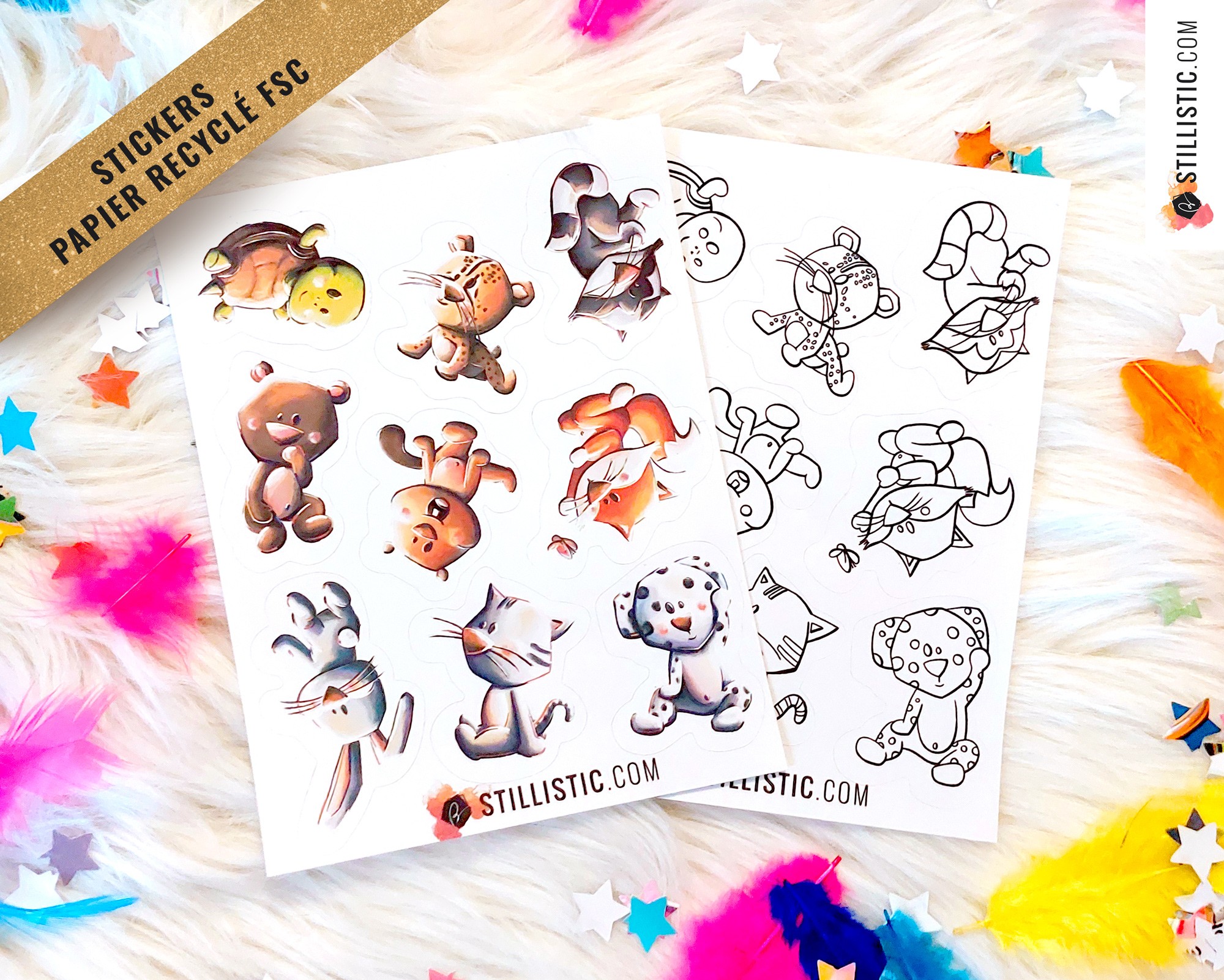 Feuille d’Autocollants vendue à l'unité pour petits et grands (DIY, loisirs créatifs, activités manuelles, scrapbooking, planner, bujo, journaling) sur le thème des bébés animaux (Tortue Guépard Raton-Laveur, ours, castor, renard, lapin, chat, dalmatien).