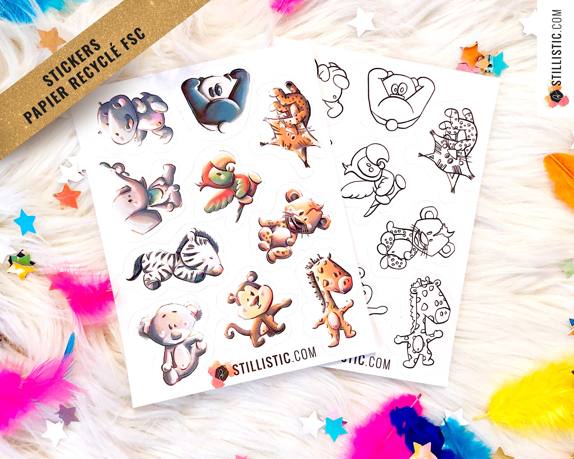Feuille d’Autocollants à Colorier vendue à l'unité pour petits et grands (DIY, loisirs créatifs, activités manuelles, scrapbooking, planner, bujo, journaling) sur le thème des bébés animaux sauvages (hippopotame, panda, lynx, éléphant, perroquet, hyène, zèbre, koala, singe, girafe).