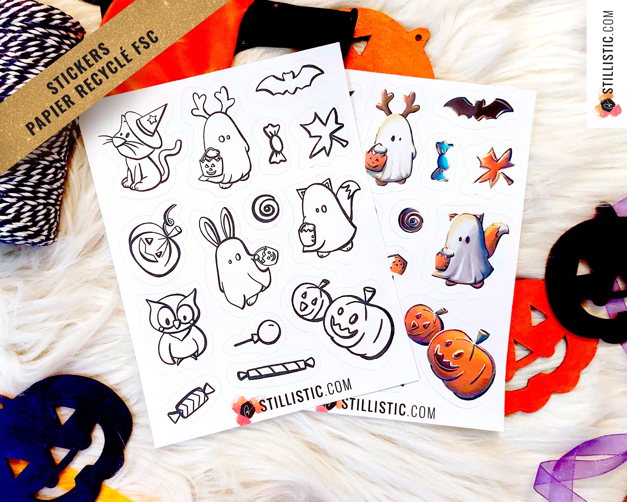 Feuille d’Autocollants à Colorier vendue à l'unité pour petits et grands (DIY, loisirs créatifs, activités manuelles, scrapbooking, planner, bujo, journaling) sur le thème d’Halloween.