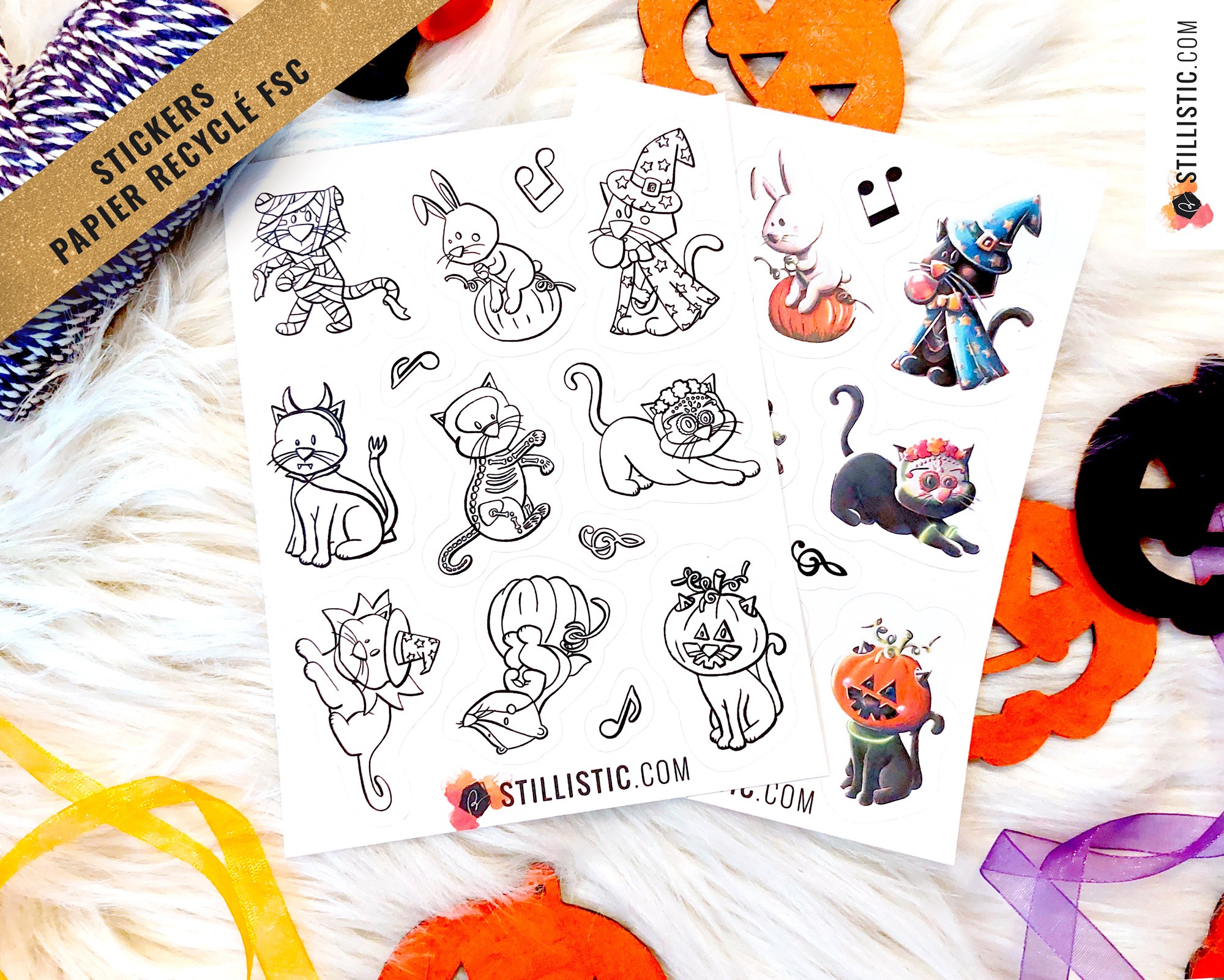Planche de stickers coloriables en papier, vendue à l'unité, sur le thème du bal masqué des Chats d'Halloween.