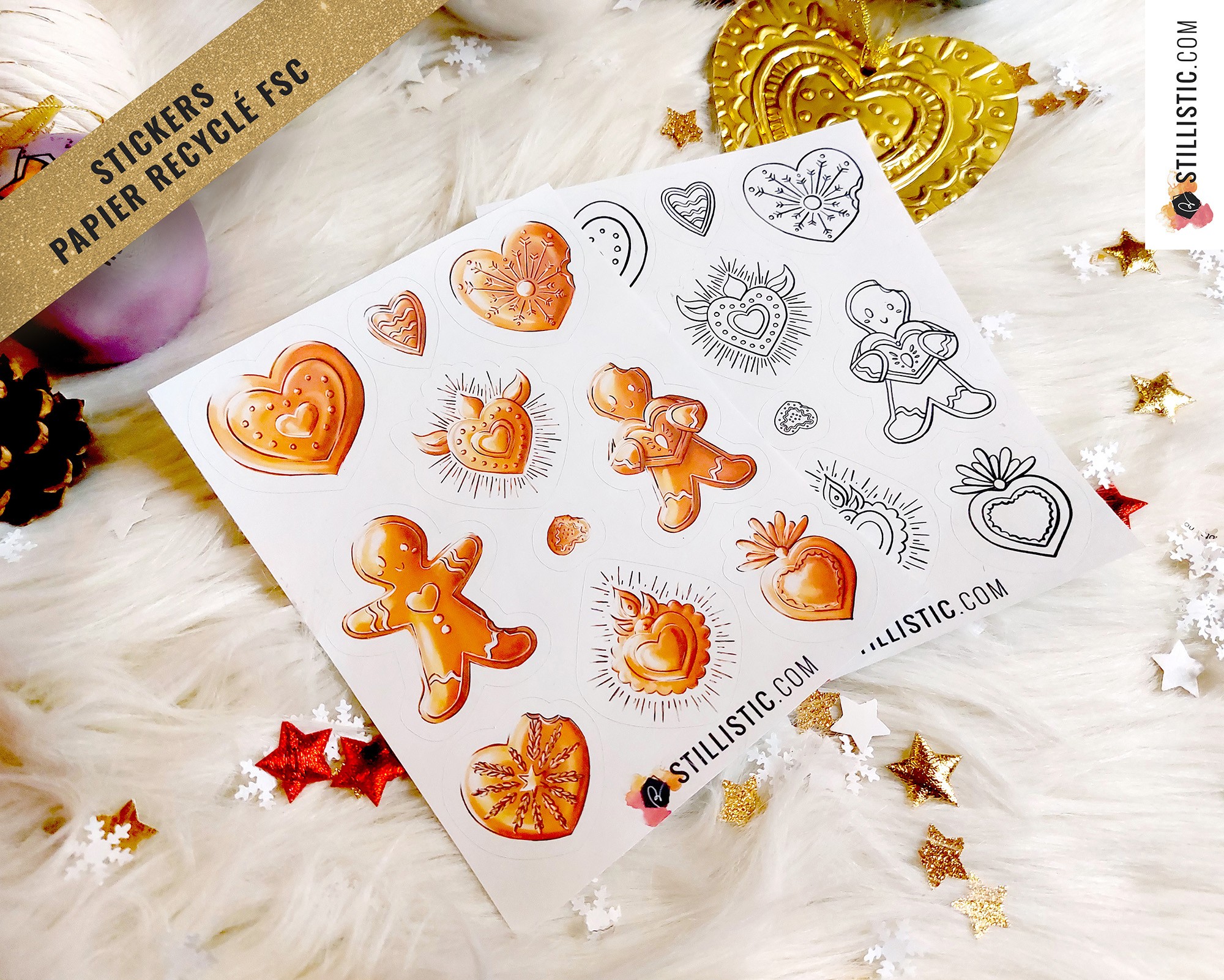 Planche de stickers coloriables en papier, vendue à l'unité, sur le thème des Pains d'épices et Ex-Voto de Noël.