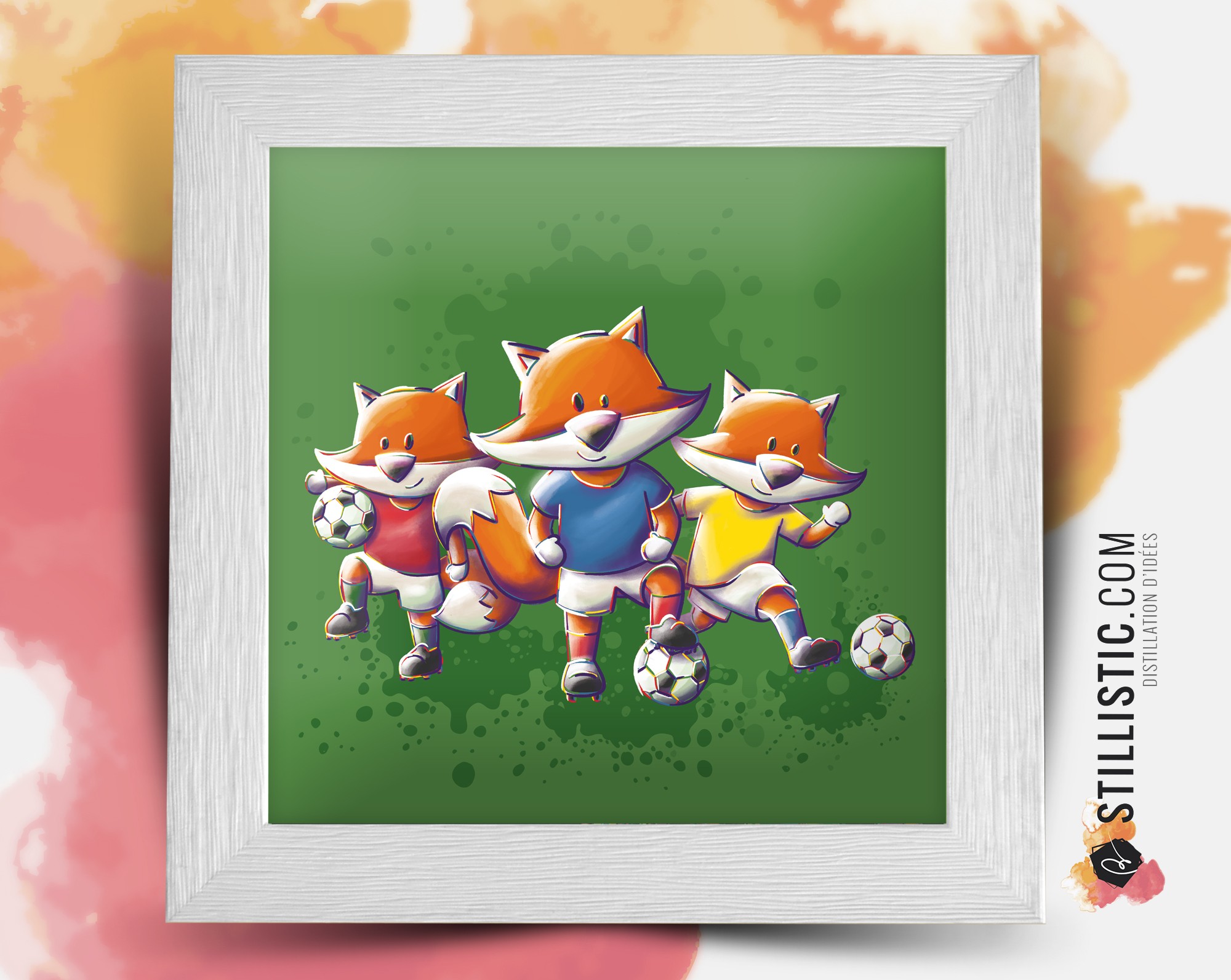 Illustration Renard Football Groupe dans un cadre carré en bois 25x25cm, idéal pour une chambre d'enfant ou de bébé !