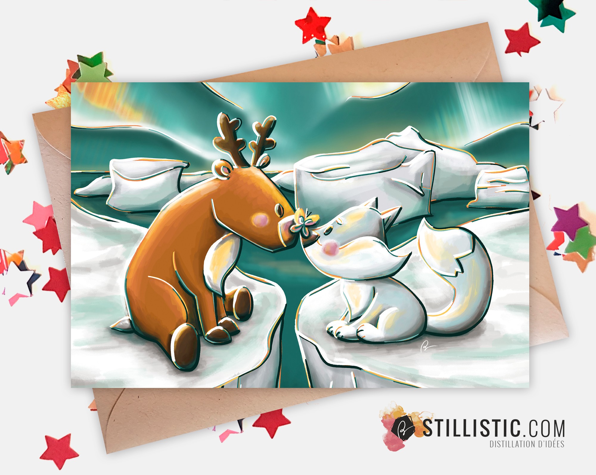 Carte de voeux papier 350g avec Illustration Originale Banquise Renne et Renard pour Noël Nouvel An Naissance