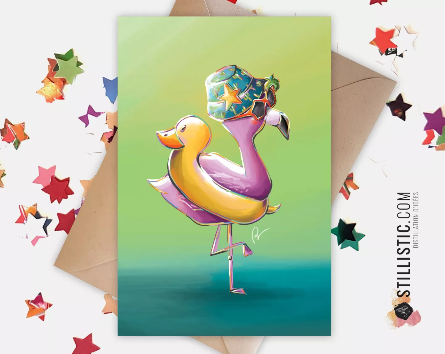Ce petit flamand rose en mode été avec ses lunettes tropicales et sa bouée canard mettra un peu d'humour et de tendresse dans vos messages !
