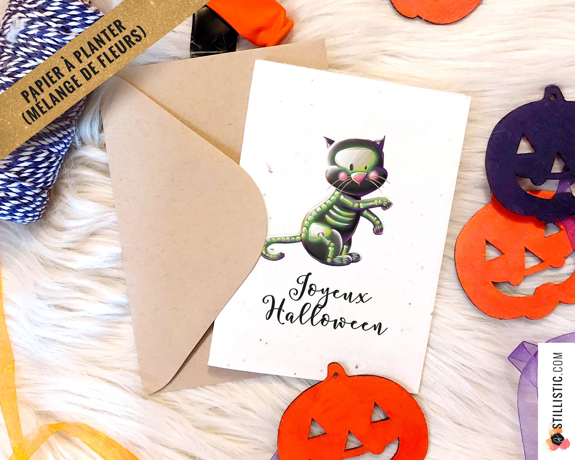 Carte de voeux à planter Halloween Chat Squelette + enveloppe Message personnalisable