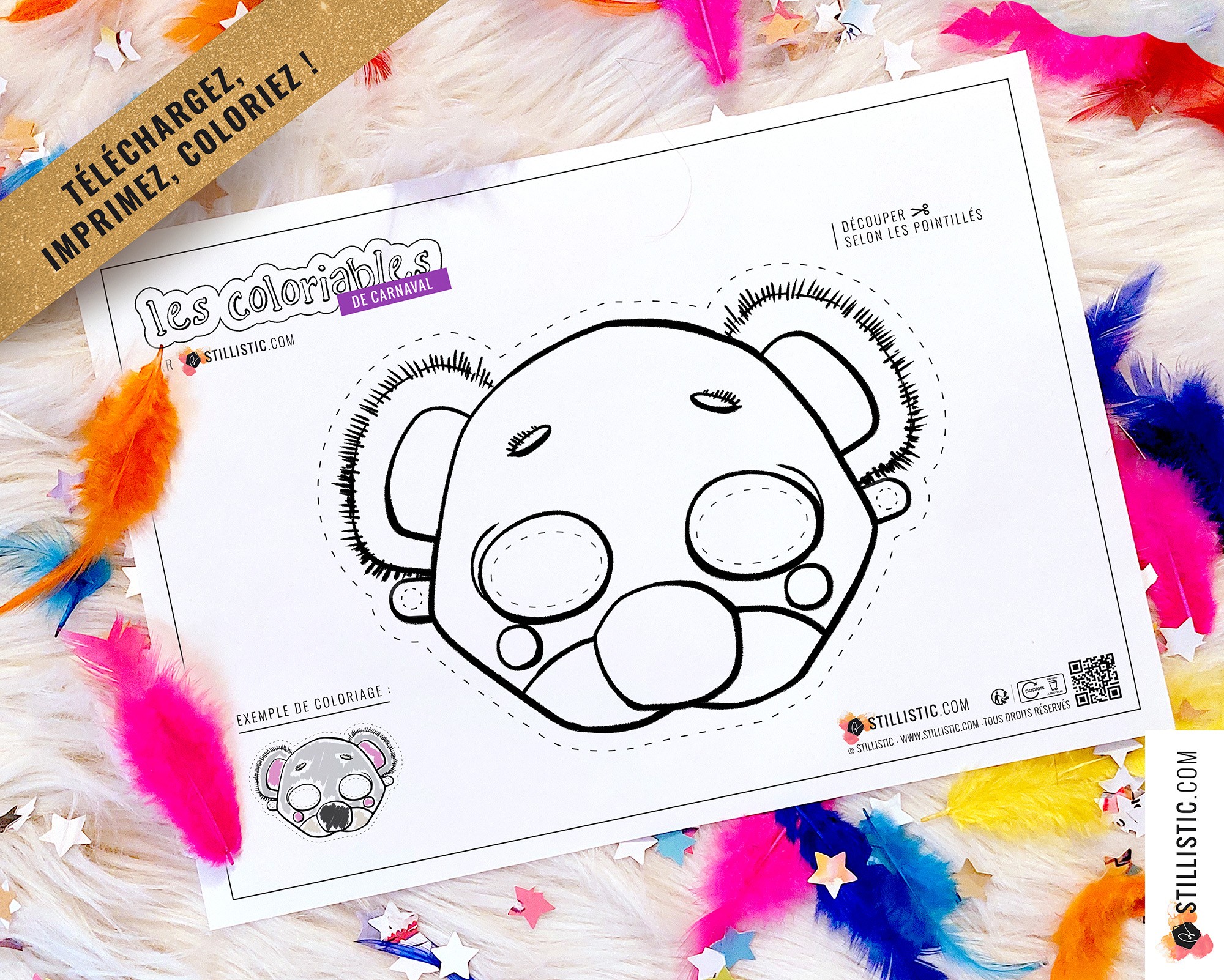 1 Masque pour enfant à imprimer et colorier pour enfants avec illustrations Koala carnaval / anniversaire