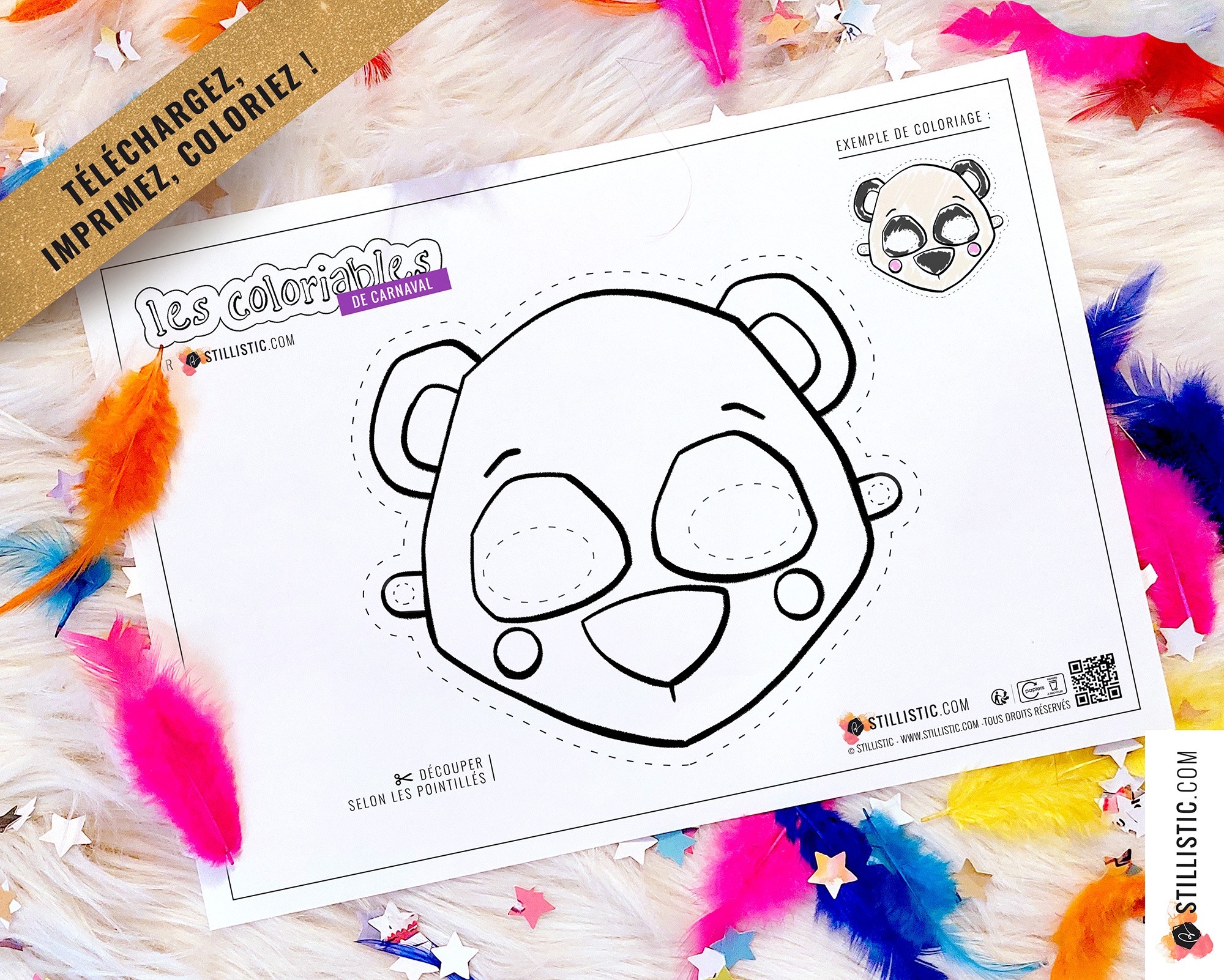 1 Masque pour enfant à imprimer et colorier pour enfants avec illustrations Panda carnaval / anniversaire