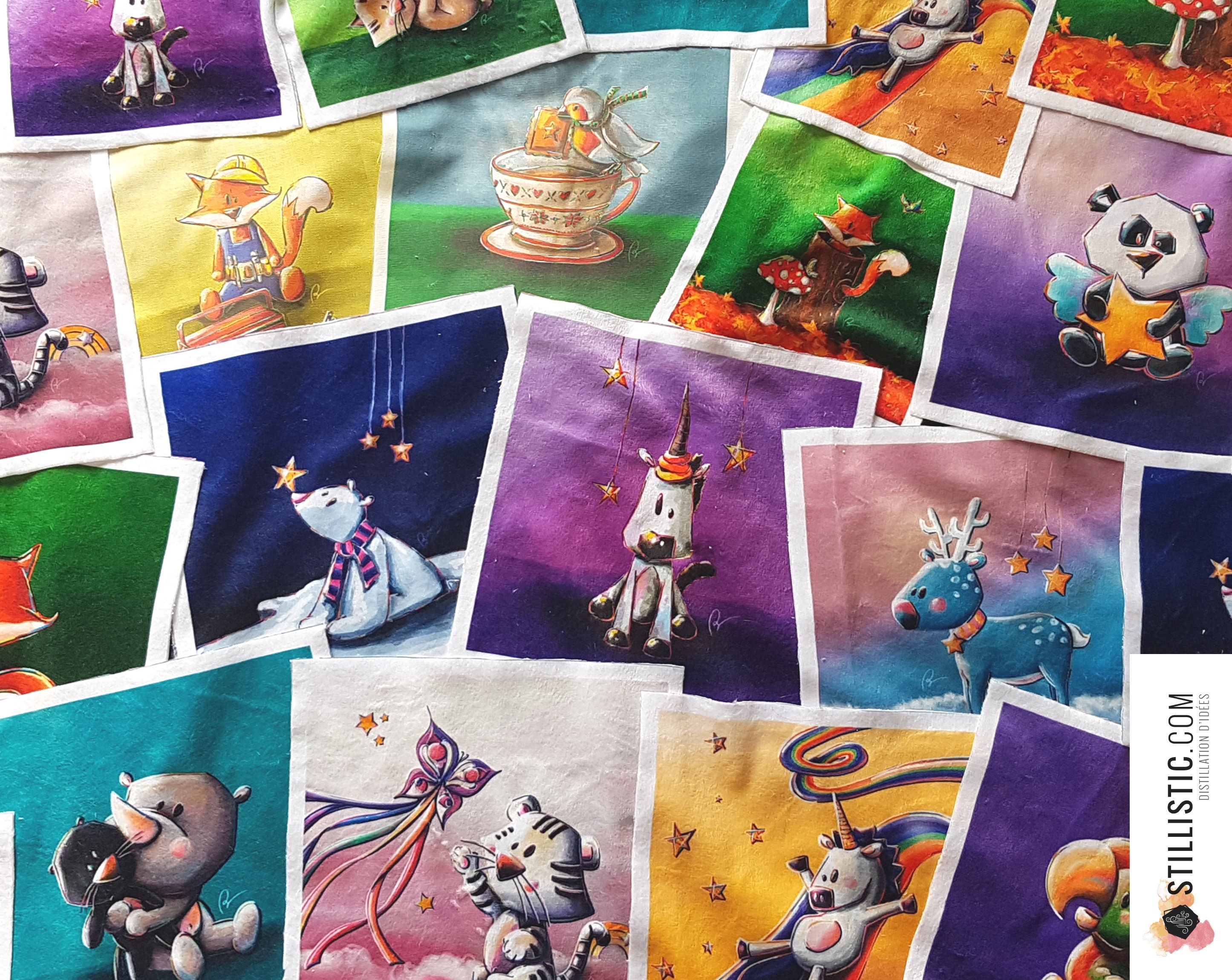 Coupon en tissu coton gots, minky, velours, simili-cuir Oekotex sans substances nocives 15x15cm ou 20x20 cm avec illustrations originales.