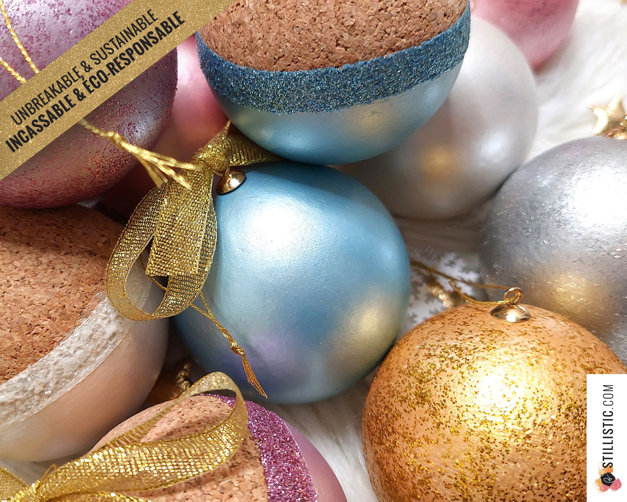 Chaque boule est unique, il se peut que certains détails diffèrent légèrement du modèle présenté sur la photo. La boule étant en liège et apprêtée à la main, elle peut présenter du grain et quelques irrégularités.