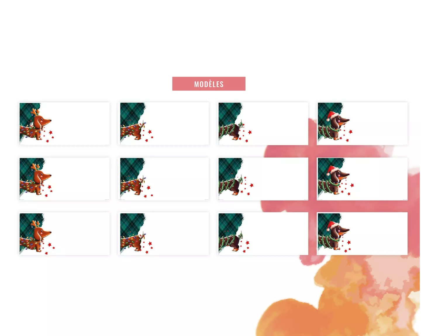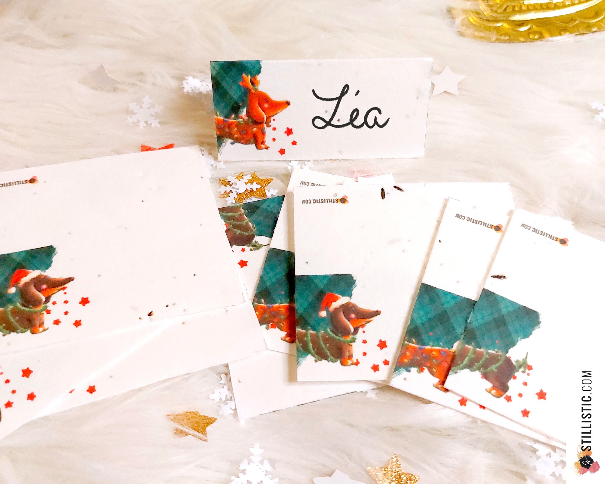 Lots de 12 marque-places / chevalets de table festifs ornés de petits Teckels de Noël (illustrations originales Stillistic) en papier ensemencé (papier incrusté de graines de fleurs sauvages) pour ajouter une touche finale et originale à vos décos de tables de Noël tout en préservant la planète !