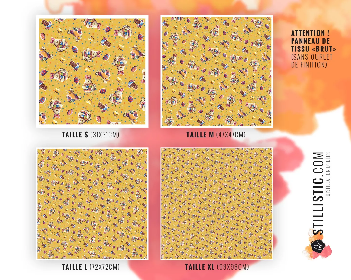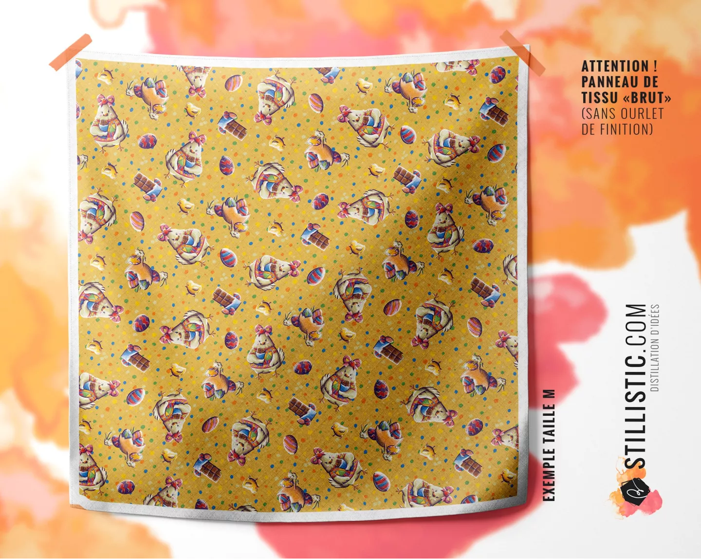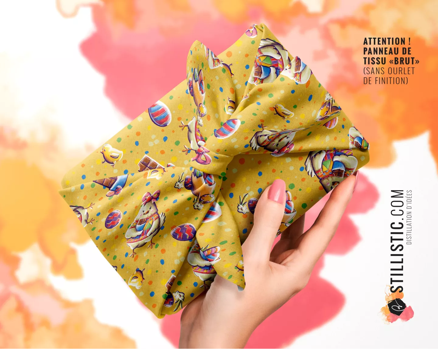 Coupon furoshiki à coudre en tissu coton motif Poulette de Pâques Jaune pour emballage cadeau éco-responsable, réutilisable et durable.