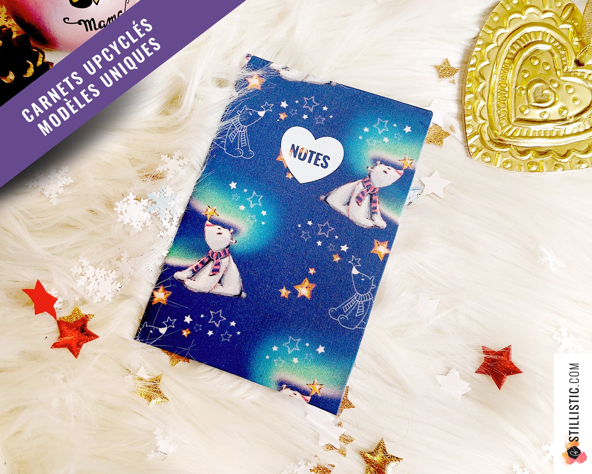 Carnets de notes en tissu motif Ours polaire upcyclés, divers formats, vierges ou lignés, réalisés à partir de lots de carnets chinés et de chutes de tissus illustré Stillistic
