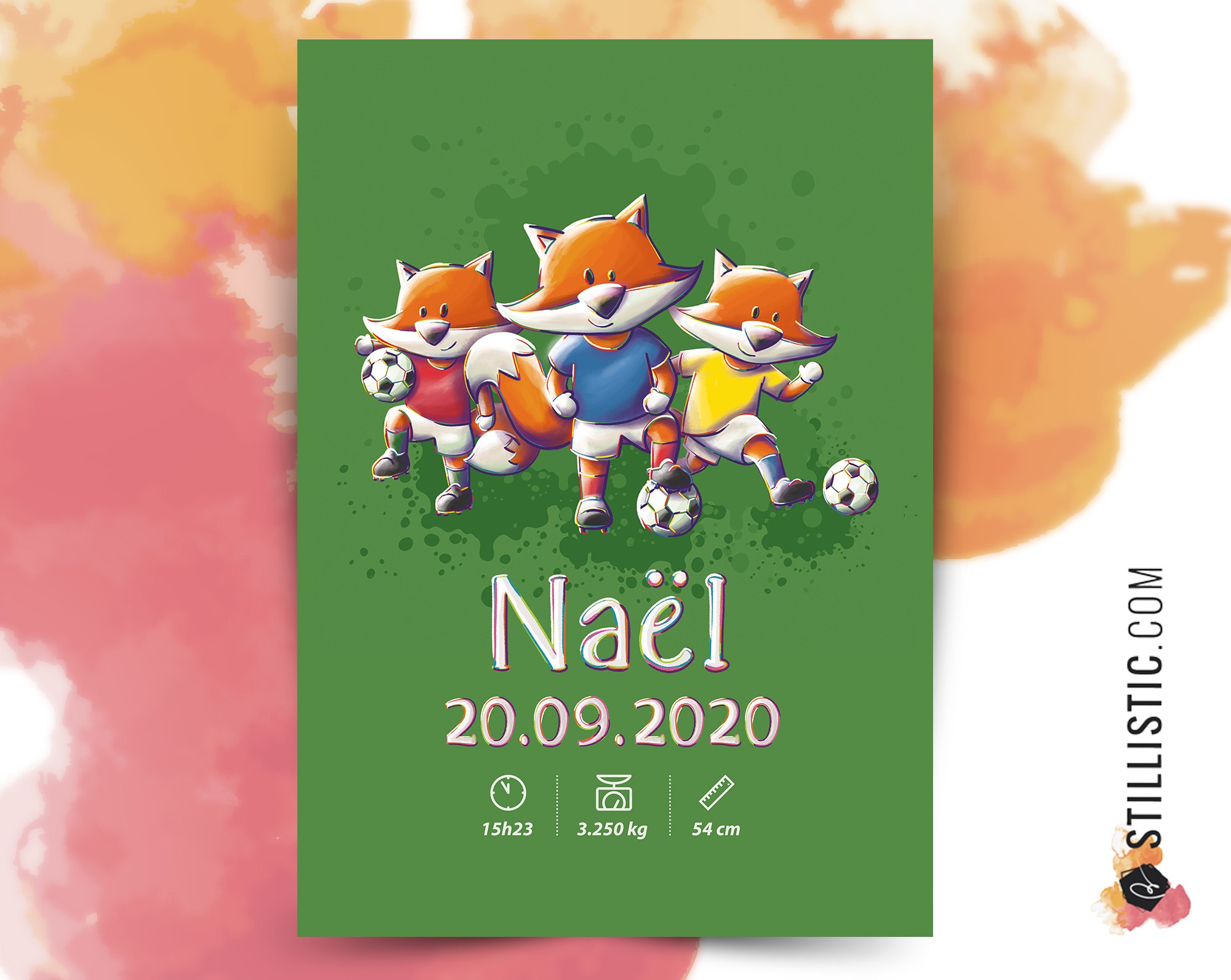Poster / Affiche de naissance avec illustration Renards Football personnalisable (prénom, date, heure, poids, taille de naissance) pour Chambre Enfant bébé